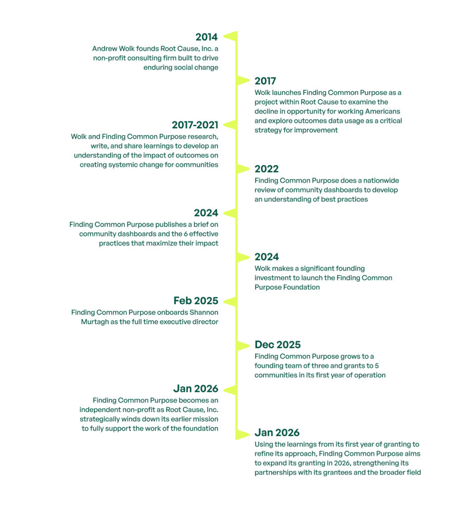 Finding Common Purpose invests in the infrastructure and capacity of place-based initiatives to set specific, transparent, and measurable outcomes that align leaders, institutions, and resources around what matters most: whether families can afford housing, whether kids are on track, and whether hard work leads to stability.
